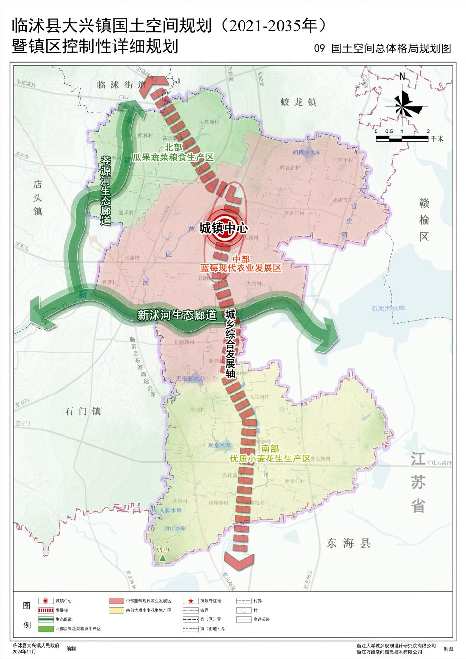 规划构建“一心一轴、两廊三区”的国土空间开发保护总体格局。“一心”指镇驻地城镇建设区,作为整个镇域的公共服务和发展中心;“一轴”指依托周大路、井涝公路形成支撑大兴镇公共服务和产业发展的城乡综合发展轴;“两廊”指新沭河、苍源河生态廊道;“三区”指北部瓜果蔬菜粮食生产区、中部蓝莓现代农业发展区、南部优质小麦花生生产区。
