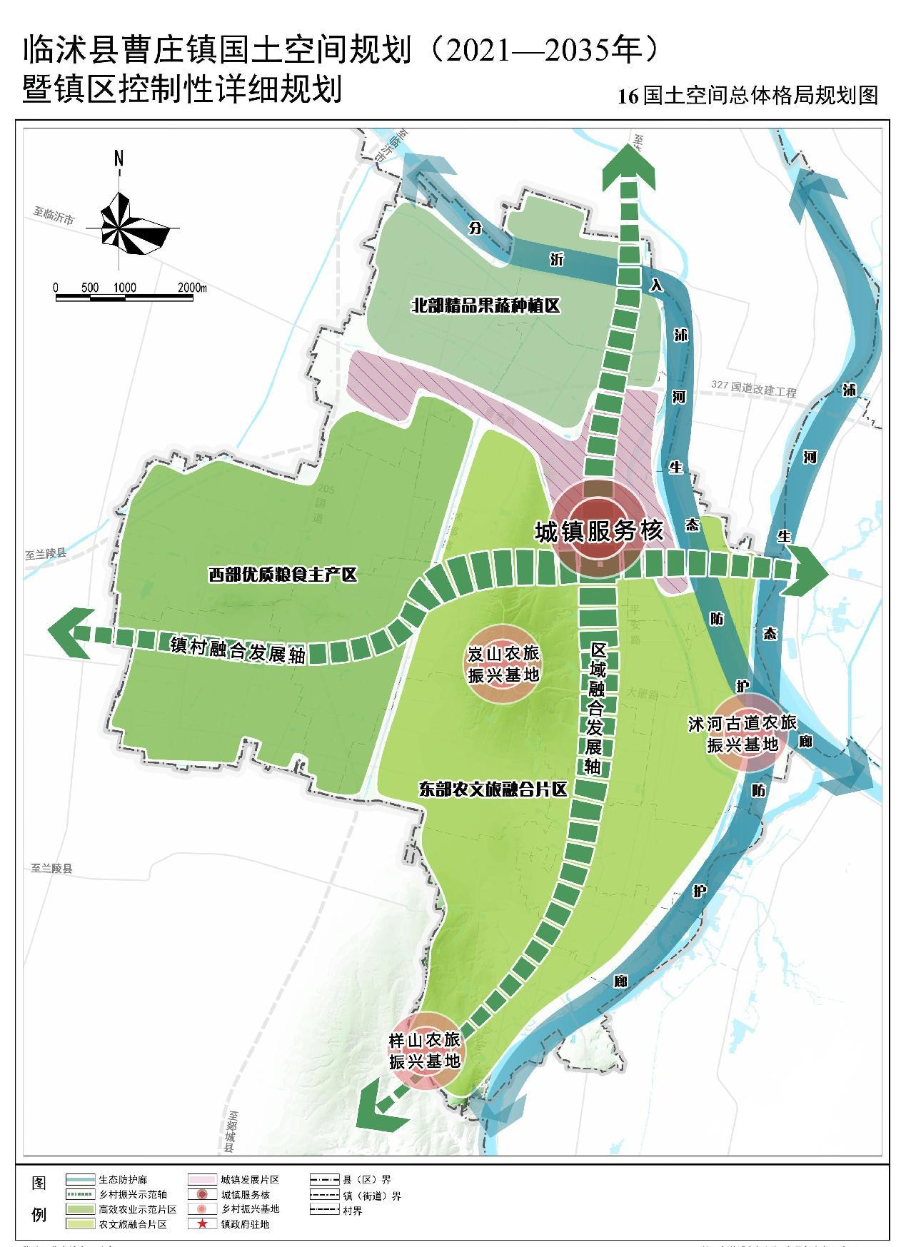 “两廊”为沿沭河和分沂入沭河两条生态防护廊,强化沭河沿线生态环境保护修复,积极推动沿河宜居宜业和美乡村建设,打造魅力景观生态廊;“四区”为加强全镇国土片区分工协同,构筑北部精品果蔬种植区、中部城镇发展区、西部优质粮食主产区、东部农文旅融合片区;“一核”为曹庄镇城镇服务核,打造主宾共享的公共服务核和旅游服务核;“两轴”即南北向区域融合发展轴、东西向镇村融合发展轴;“三基地”包括沭河古道农旅振兴基地、岌山农旅振兴基地、样山农旅振兴基地。