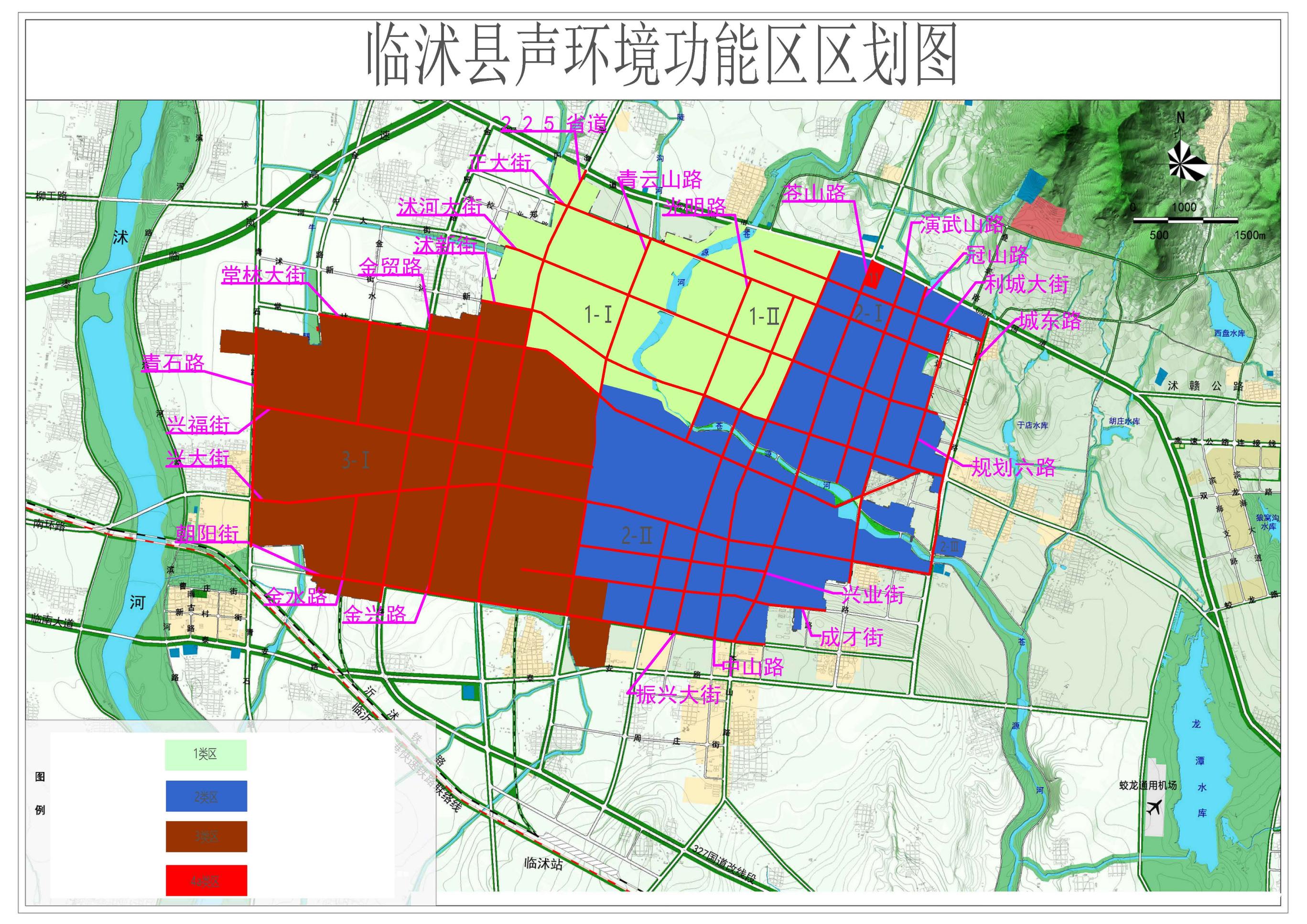 当临街建筑高于三层楼房以上(含三层)时,将临街建筑面向交通干线一侧至交通干线边界线的区域(见表2)定为4a类声环境功能区; 交通干线建设规划未实施前应按照当前声环境功能区类别管理,规划实施后实时调整为4类声环境功能区。 (七)4b类声环境功能区划分 交通干线边界线外一定距离以内的区域划分为4b类声环境功能区。距离的确定方法见表2。 对于4b类声环境功能区与4a类声环境功能区有重叠的部分,划定为4b类声环境功能区。 (八)乡村声环境功能区的确定 对于本次功能区划工作中未涉及到的乡镇、村庄等区域,根据《声环境质量标准》(GB3096—2008)的相关规定:乡村区域一般不划分声环境功能区,根据环境管理的需要,由临沂市生态环境局临沭县分局按以下要求确定乡村区域适用的声环境质量要求: 1、位于乡村的康复疗养区执行0类声环境功能区要求; 2、村庄原则上执行1类声环境功能区要求,工业活动较多的村庄以及由交通干线经过的村庄(指执行4类声环境功能区要求以外的地区)可局部或全部执行2类声环境功能区要求; 3、集镇执行2类声环境功能区要求; 4、独立于村庄、集镇之外的工业、仓储集中区执行3类声环境功能区要求; 5、位于交通干线两侧一定距离(参考GB/T15190—2014第8.3条规定)内的噪声敏感建筑物执行4类声环境功能区要求。 (九)其它规定 1、3类声环境功能区 位于各类工业区控制性详细规划范围,总体上划定为3类声环境功能区的,在下列情况下执行2类声环境功能区标准: (1)规划为工业用地,但尚未开发建设,且仍有敏感目标的区域; (2)现状为学校、医院、住宅、机关、公园、宾馆、会所等噪声敏感区域; (3)开发区详细规划确定为非工业用地的区域; (4)以商务办公、软件研发等为主的非生产区域(除工业地产外)。 2、4类声环境功能区 (1)对于规划未建成的高速公路、城市快速路、城市轨道交通(地面段)、城市主干路、城市次干路、铁路,建成后在向生态环境部门备案后,相应划分到4a/4b类声环境功能区,并执行相应标准; (2)划分4类声环境功能区时,不同的道路、不同的路段、同路段的两侧及道路的同侧其距离可以不统一; (3)城市轨道交通(地面)场站、公交枢纽、高速公路服务区等具有一定规模的交通服务区域,划定为4a类声环境功能区;铁路交通场站划定为4b类声环境功能区。 3、大型公园、风景旅游区和纪念馆等区划为1类标准适用区域; 4、大型工业区中的生活小区,根据其与生产现场的距离和环境噪声现状水平,可从工业区中划出,定为2类声环境功能区; 5、各类区域之间不划过渡地带; 6、在已划定声环境功能区内新建的交通干线,应确保隔声降噪措施,维持用地的区划类别现状;若确实导致区域声环境质量现状与区划目标相差太大,可在城市规划逐步完善的前提下,按要求对新建交通干线区域划分为4a类或4b类声环境功能区; 7、近期内区域功能与规划目标相差较大的区域,以用地现状作为区划的主要依据;随着城市规划的逐步实现,及时调整声环境功能区; 8、未建成的规划区内,按其规划性质或按区域声环境质量现状,结合可能的发展划定区域类型。 (一)0类声环境功能区 根据我县城区实际情况及建设用地规划,区划范围内不具备0类声环境功能区要求,所以本次划分不划定0类声环境功能区。 (二)1~3类功能区 根据各地块的用地功能和分布情况,结合周边道路、绿地、沟壑等线状分界线,将城区划分为2个1类区,面积6.268km2;3个2类区,面积10.264km2;1个3类区,面积16.008km2。临沭县城区1~3类功能区划分结果见表3和附图1。 (三)4a类功能区划分结果 本次划分将临沭县汽车站划分为4a类功能区,面积为0.06km2。确定各类公路及城市道路交通干线共24条。其中,主干道路12条,次干道路12条,4a类交通干线分布情况及(边界)相邻4a类声功能区的距离见表4和附图1。 表3临沭县区1~3类声环境功能区划分情况表