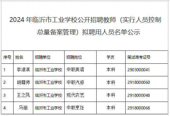 | 2024年临沂市工业学校公开招聘教师(实行人员控制总量备案管理)拟聘用人员名单公示 | ||||||||||||||||||||||||