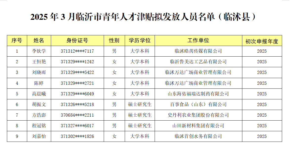 按照《临沂市青年人才津贴发放实施办法(试行)》和《关于做好临沂市青年人才津贴申报审核工作的通知》有关要求,人社部门组织完成了“无形认证”、网上申报、审核确认等工作,现将我县2025年3月临沂市青年人才津贴拟发放人员进行公示,公示期为2025年4月7日-4月11日。公示期间,如对公示人选有异议,请于2025年4月11日17:00前反馈临沭县人社局。 联系人:朱文静吴倩 联系电话:0539-2983227 临沭县人力资源和社会保障局 2025年4月7日