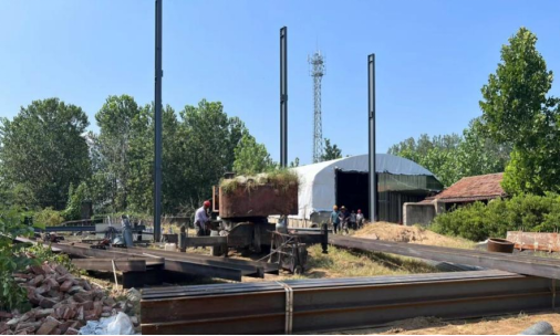 8月15日,临沭县店头镇顶子村某村民家里,一辆吊车正在吊起一根根钢柱,搭起一个个支架,施工人员也在如火如荼的施工。据悉,这是该村村民家里需要存放农机农具的地方,通过村委了解,该施工项目已取得备案,手续齐全合法。