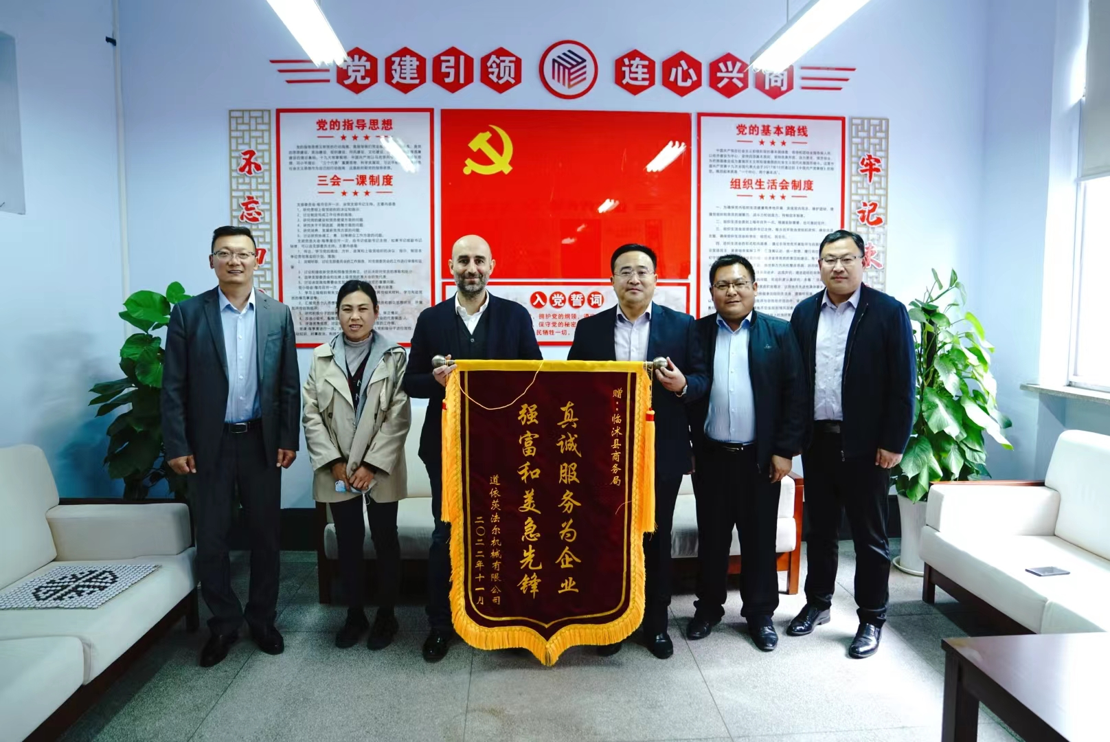 11月4日,道依茨法尔机械有限公司总经理Alessio Pulcini(阿莱西奥·普契尼)先生一行专程来到临沭县商务局,送来一面印有“真诚服务为企业强富和美急先锋”的锦旗,以此感谢商务局在10月份疫情期间协调解决进口关键零部件因物流受阻不能来沭的难题,帮助企业挽回经济损失5400万元。这是商务局真情为企业服务的具体实践,也是深入贯彻落实市委构建“3+1”理论武装工作体系要求的具体行动。