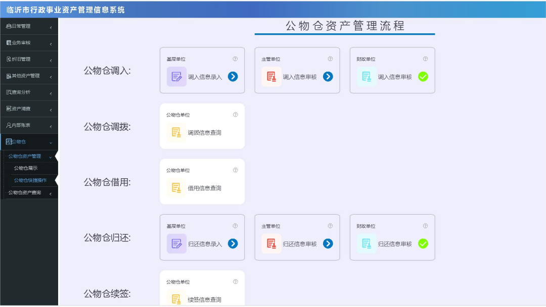为推进行政事业单位国有资产共享共用,提高资产使用效益,临沭县财政局创新公物仓管理模式,构建“线上+线下”一体化公物仓管理新模式,对单位闲置、超标配置等资产,进行统一调配、共享共用。 一、 完善制度 规范公物仓管理 出台《临沭县公物仓管理暂行办法》(沭财国〔2020〕4号)、《临沭县县级行政事业单位通用资产配置标准》,明确公物仓资产管理按照“单位申请-部门审核-财政审批-公物仓承办”分工负责的管理体制,对公物仓资产配置、使用、处置进行规范。通过完善管理制度,促进公物仓规范有序运行,达到国有资产共享、共用的目的,既实现了对国有资产全生命周期规范管理,又提高资产使用效益,有效节约了财政资金。