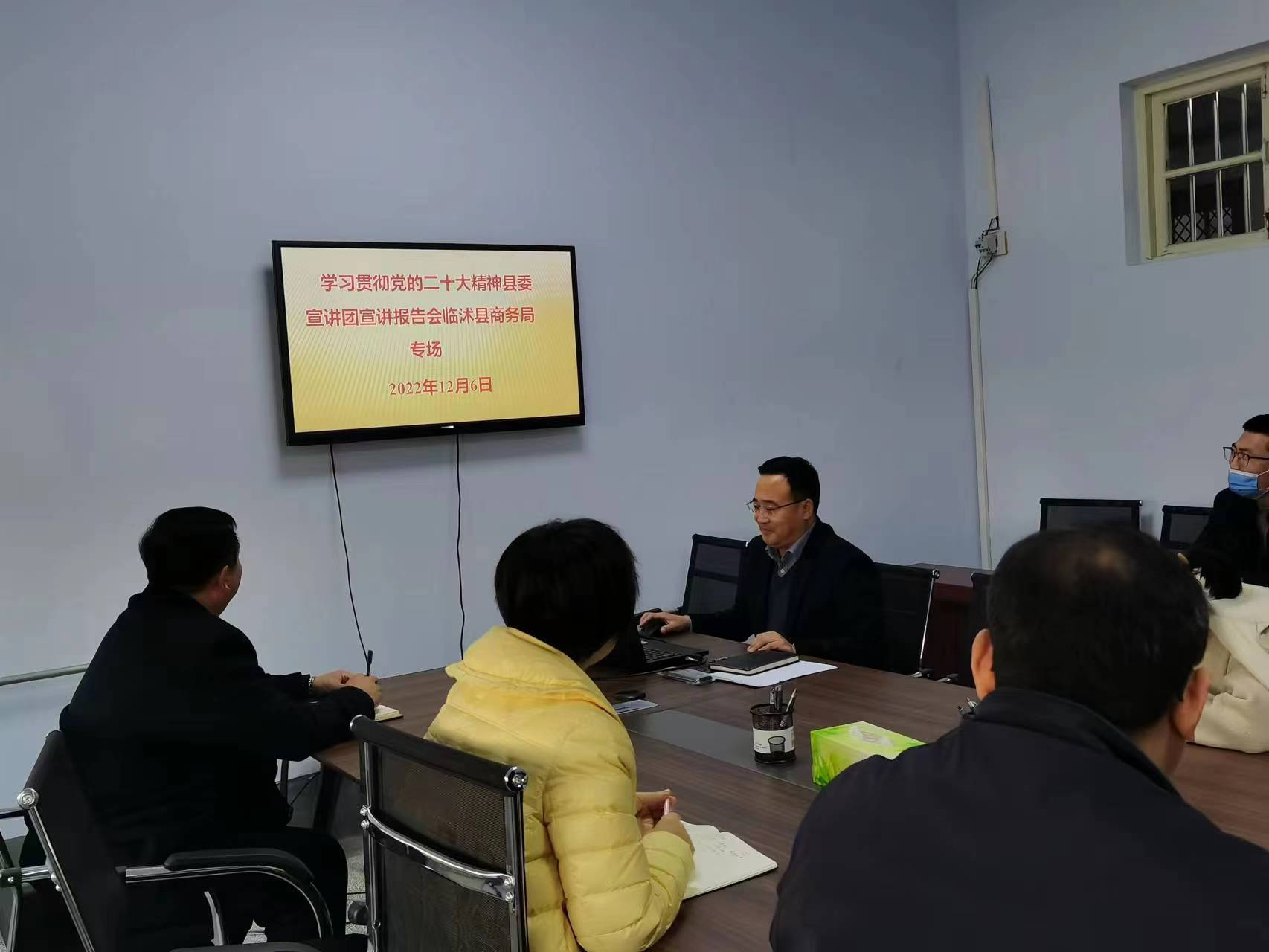 12月6日上午,县委宣讲团成员李光宇在临沭县商务局进行学习贯彻党的二十大精神专题宣讲,商务局全体干部职工参加报告会。