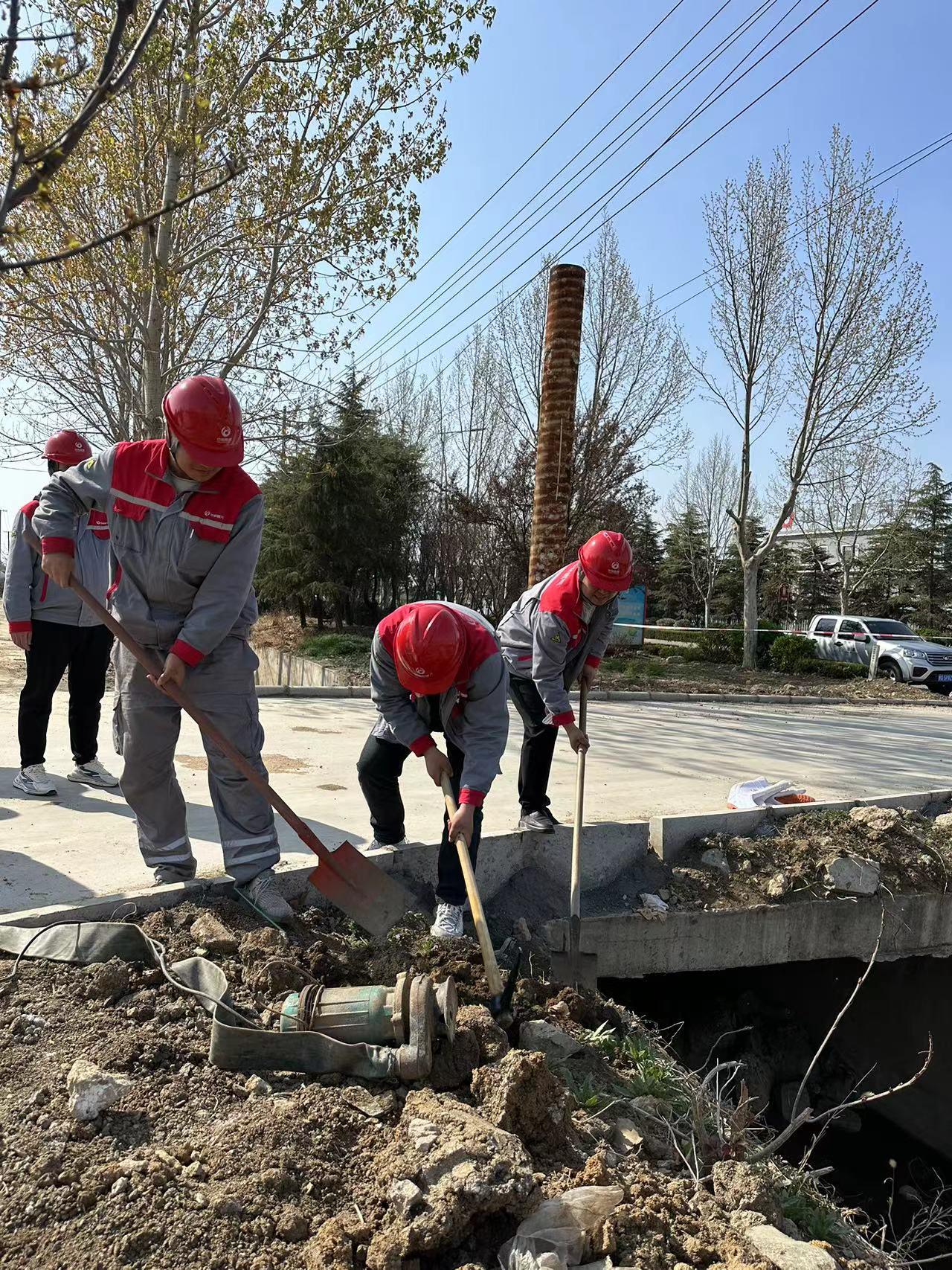 现场警戒 演练模拟连续雨水天气,造成沟渠雨水上涨,对跨河架空沿线燃气管线造成安全风险。接到事故警报后,燃气公司紧急启动自然灾害事故应急抢险应急预案,组织员工携带铁锨、铁镐、水泵等应急工具前往事故现场,通过对沟渠开挖疏通等方式,对河道燃气管道进行保护,防止大水冲击沿线燃气管道造成安全事故。