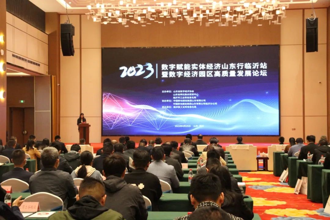 4月25日上午,数字赋能实体经济山东行临沂站暨数字经济园区高质量发展论坛在临沭成功召开。山东省工业和信息化厅数据产业推进处副处长王俊人,临沂市工业和信息化局党组成员、副局长沈玲,临沭县政府副县长苗壮,临沭县工信局党组成员、局长崔广祥,临沭县移动公司总经理刘朝余出席会议;各区县工信部门有关领导同事,部分省级数字经济园区负责人以及重点工业企业代表共计150余人参加本次会议。