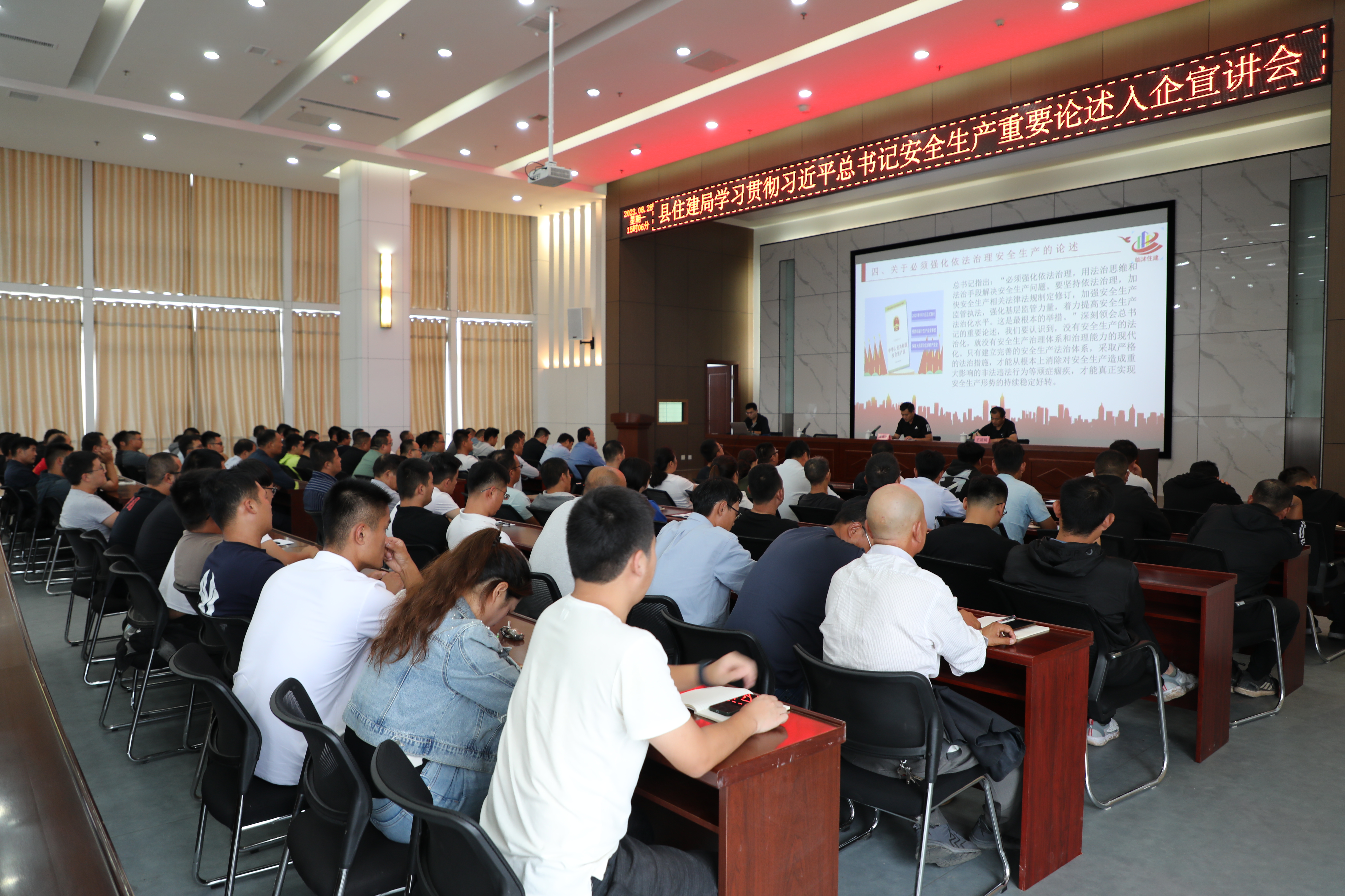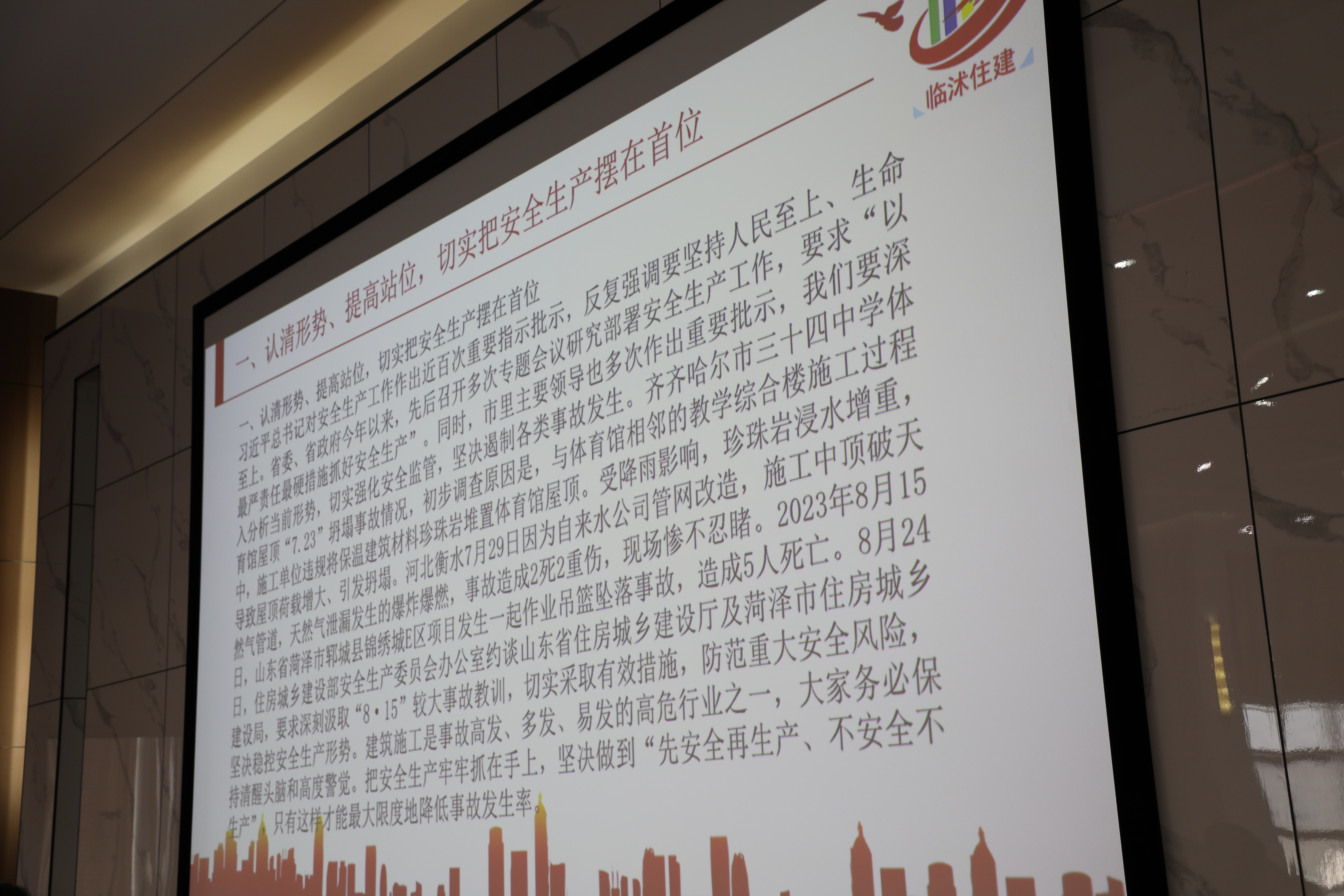 8月28日下午,临沭县学习贯彻习近平总书记关于安全生产重要论述入企会在金明寓建设集团公司办公大楼15楼会议室召开。来自全县建筑行业的210名安全生产责任人参加了会议。县住建局党组书记、局长高冬子出席会议并讲话。 会议由金明寓建设集团公司总经理王顶明主持。会上,与会人员集中观看了安全生产警示教育专题片,县住建局党组书记、局长高冬子结合习近平总书记关于安全生产重要论述以及作出的重要指示批示,提出了一系列新思想、新要求和新观点。要求全县各级各建筑企业和各在建工地要时刻绷紧安全生产这根“弦”,抗牢建筑施工安全生产责任,筑牢高质量发展的安全底板,为加快“强富和美”现代化临沭建设做出新的贡献。