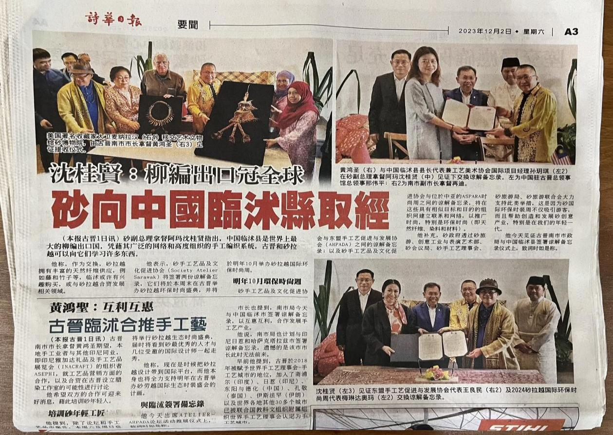 论坛期间,中国工艺美术协会国际项目经理孙玥琪代表我县与古晋市签署了《世界手工艺理事会手工艺城市合作备忘录》并作题为“临沭柳编-编织世界”演讲,推介我县柳编产业的先进生产和管理经验,打造生态产业的优势。沙捞越州副总理沈桂贤、中华人民共和国驻古晋总领事邢伟平、古晋市副市长再迪苏海里见证签约。通过签署合作备忘录,古晋市与我县将本着互利的原则,通过文化和教育交流,共同促进手工艺产业提升和发展,在研究、创新和经济举措等手工艺相关活动中开展合作。