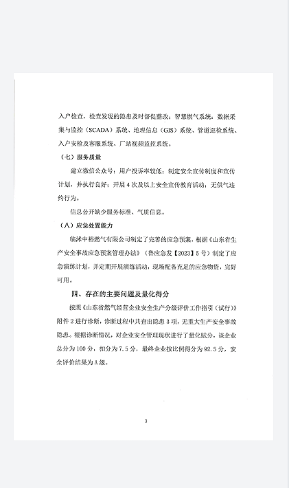 二、临沭中裕燃气有限公司安全生产分级评估公示A级
