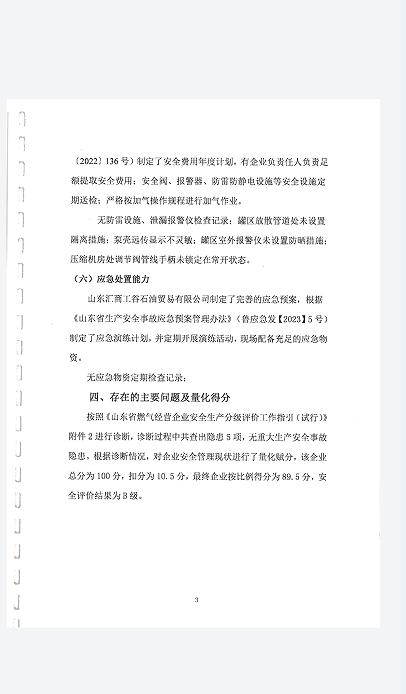 三、山东汇商工谷石油贸易有限公司(富海加气站)安全生产分级评估公示B级