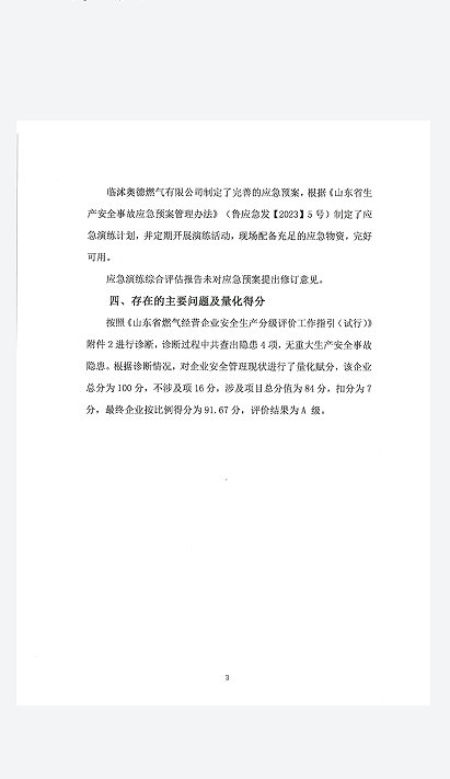 一、临沭奥德燃气有限公司安全生产分级评估公示A级