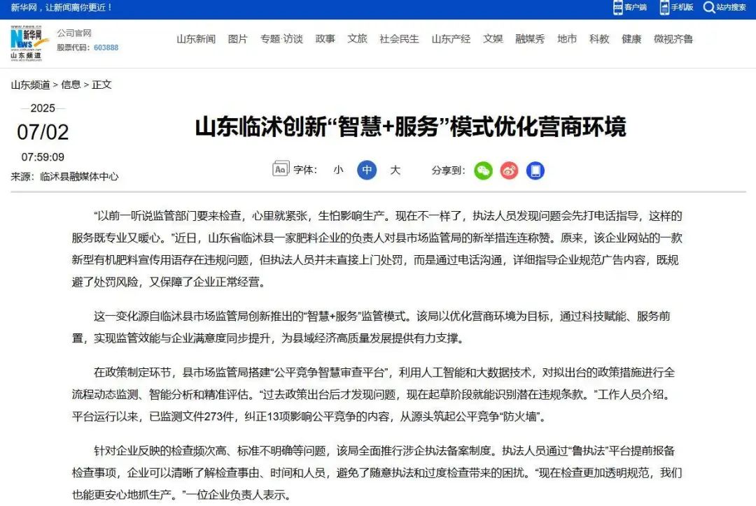 “以前一听说监管部门要来检查,心里就紧张,生怕影响生产。现在不一样了,执法人员发现问题会先打电话指导,这样的服务既专业又暖心。”近日,山东省临沭县一家肥料企业的负责人对县市场监管局的新举措连连称赞。原来,该企业网站的一款新型有机肥料宣传用语存在违规问题,但执法人员并未直接上门处罚,而是通过电话沟通,详细指导企业规范广告内容,既规避了处罚风险,又保障了企业正常经营。 这一变化源自临沭县市场监管局创新推出的“智慧+服务”监管模式。该局以优化营商环境为目标,通过科技赋能、服务前置,实现监管效能与企业满意度同步提升,为县域经济高质量发展提供有力支撑。 在政策制定环节,县市场监管局搭建“公平竞争智慧审查平台”,利用人工智能和大数据技术,对拟出台的政策措施进行全流程动态监测、智能分析和精准评估。“过去政策出台后才发现问题,现在起草阶段就能识别潜在违规条款。”工作人员介绍。平台运行以来,已监测文件273件,纠正13项影响公平竞争的内容,从源头筑起公平竞争“防火墙”。 针对企业反映的检查频次高、标准不明确等问题,该局全面推行涉企执法备案制度。执法人员通过“鲁执法”平台提前报备检查事项,企业可以清晰了解检查事由、时间和人员,避免了随意执法和过度检查带来的困扰。“现在检查更加透明规范,我们也能更安心地抓生产。”一位企业负责人表示。 此外,县市场监管局还创新推出“体检式”服务,执法人员化身企业“健康顾问”,围绕食品安全、特种设备等重点领域主动上门开展风险排查,现场开具“整改处方”并跟踪指导。目前,已为35家企业解决经营难题,实现了从“被动监管”到“主动服务”的转变。 更让企业感到便利的是“无感式”监管模式。借助大数据分析、远程监测等技术手段,县市场监管局能够实时掌握企业经营数据、经营行为等情况。例如,广告监测系统自动筛查企业广告宣传合规性。发现问题后,如果情节轻微,未造成危害后果的,优先采取非接触式行政指导,帮助企业改正违规行为,减少对企业经营的干扰。“没见到执法人员,问题就解决了,这样的监管方式既高效又贴心。”一位企业负责人说。 从智慧审查到执法备案,从“体检式”服务到“无感式”监管,临沭县通过一系列创新举措,真正做到了“监管有力度、服务有温度”。如今,企业迎检负担减轻了,合规成本降低了,市场活力进一步释放。(王芳 陈志高 吴泽豪)