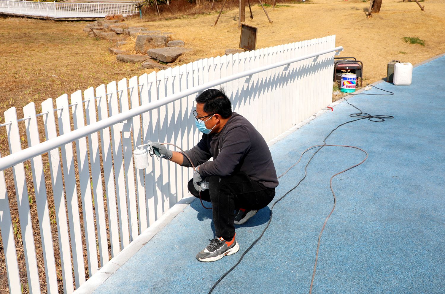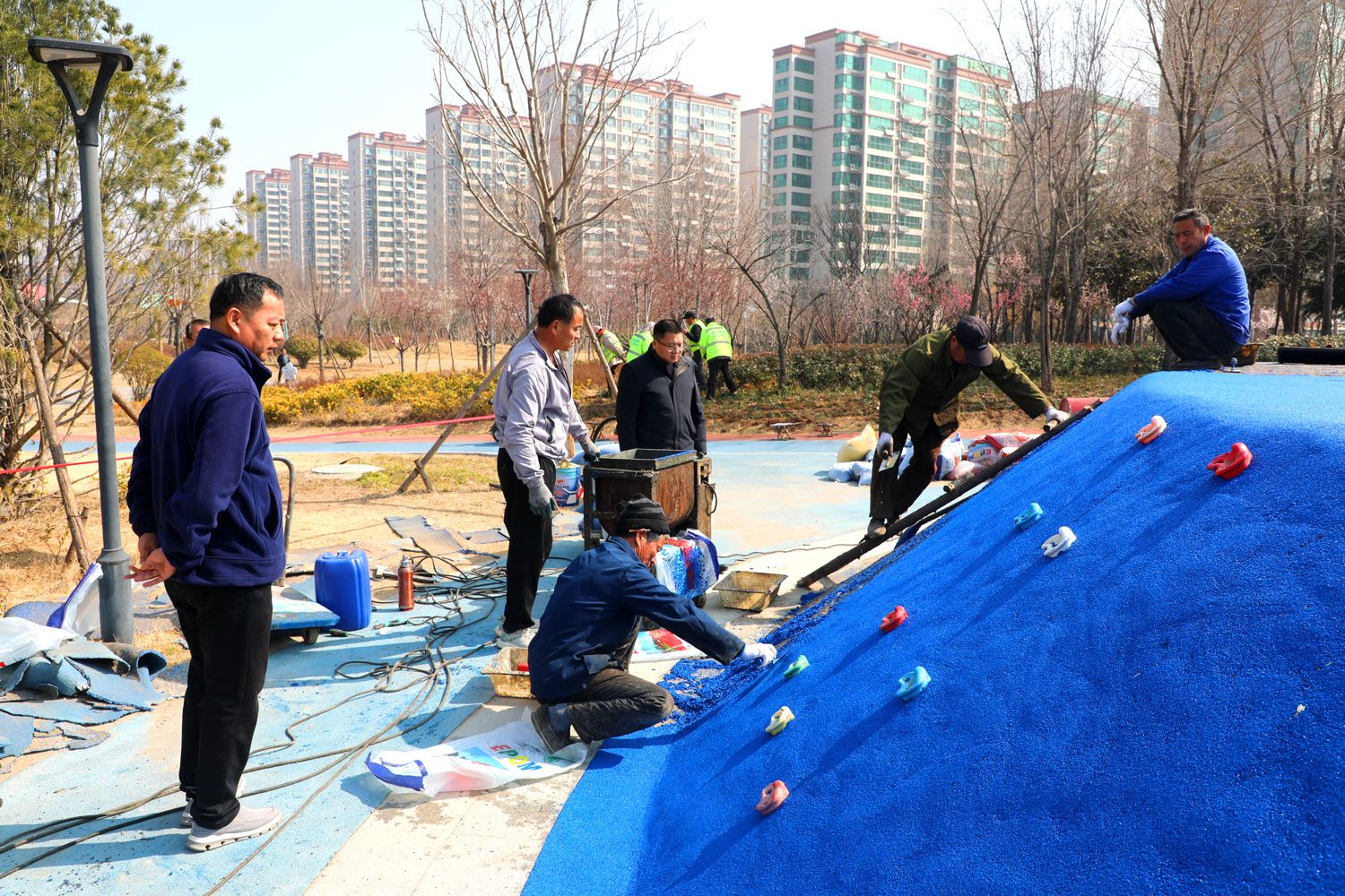 人民公园自投入使用向市民开放以来,由于游园群众日益增多、公园设施使用频次高、长期受露天和自然环境等因素影响,公园内的部分设施出现破损,存在安全隐患影响设施正常使用。为保障公园基础设施完好和游园群众安全,临沭县综合行政执法局及时启动公园基础设施维护修缮工作。此次检查维修主要对公园、广场内的地面、栈道、儿童游乐健身器材、公园景观设施等进行修复。施工现场,维修人员有的对损坏的儿童游乐设施进行修缮,对破损的儿童攀爬设施重新铺设彩色塑胶坡道;有的对生锈的栈道桥栏进行除锈喷漆,有的对损坏的大花篮进行编织修补,有的对缺损的绿化苗木进行补植……经过施工人员繁忙的修缮维护,损坏修复的公园设施又焕然一新。