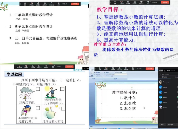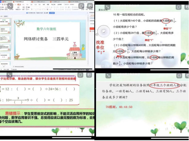 “一枝独秀不是春,百花齐放春满园。”为了进一步提高教师的教学能力,充分发挥教师的集体智慧,让教师在交流中进行思想的碰撞,集思广益,博采众长。店头镇各年级数学教师在教研员李彦玮老师的指导下,于10月13日下午开展了数学第三四单元的线上集体备课活动。 各年级组组长针对备课提前进行了分工安排,明确了备课的具体要求。活动时,先由组长对三、四单元的主要内容进行梳理,接着由主备老师对单元重点课时教学设计进行解读,对单元重点题型及易错题进行分析。再由同年级组的其他老师进行补充、质疑,大家畅所欲言,互相交流,讨论,让思想碰撞出智慧的火花,努力提高课堂效率,打造高效课堂。 六个年级组都精心准备,展现了各自的风采。 一年级组集备展示