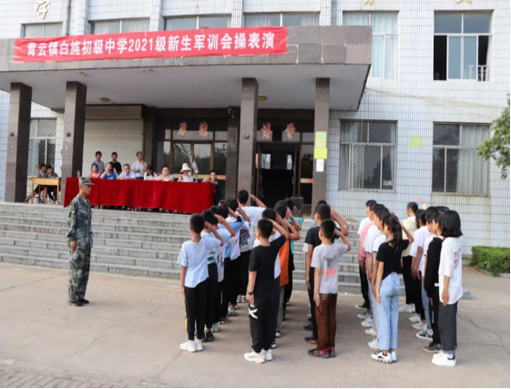 9月14日,青云镇白旄初级中学举行2021级新生军训汇演。各班级新生方队步伐整齐地跑步进场,把军姿、敬礼、立正、稍息、对齐、停止间转法、齐步走、跑步等训练项目在主席台前依次进行展示,学生会操表演动作规范、口号响亮,展示出军训的坚实成果。会操表演结束后,各班级进行了军歌《团结就是力量》的拉练。汇演后,校长王春涛对本次军训汇演作总结讲话,他对全体同学5天来严格训练所取得的成绩表示非常满意,鼓励同学们再接再厉,把不怕吃苦、顽强拼搏的精神,用于今后的学习和生活中去,以创造更加美好的未来。
