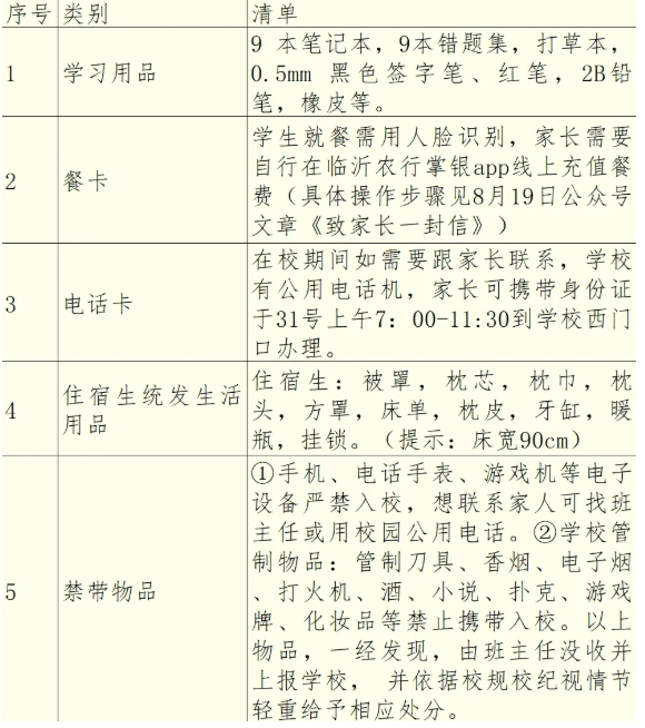 | 临沭第一中学2025级高一新生开学须知 | ||||||||||||||||||||||||