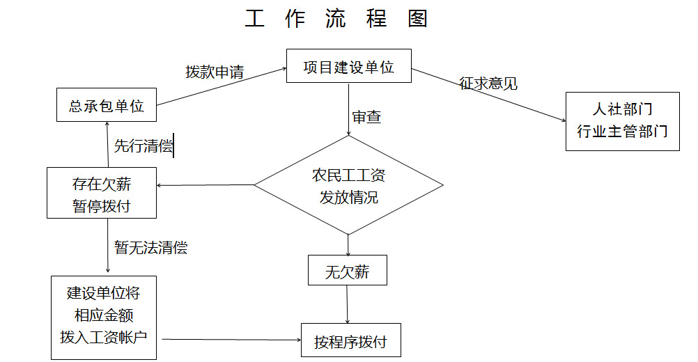 沭政办字〔2023〕17号 各镇人民政府、街道办事处,县直有关单位,经济开发区管委会: 《规范政府、国有企业投资建设项目中欠薪问题的管理办法(试行)》已经县政府研究同意,现印发给你们,请结合实际认真抓好贯彻落实。 临沭县人民政府办公室 2023年5月6日 (此件公开发布) 规范政府、国有企业投资建设项目中欠薪问题的管理办法(试行) 第一条 为进一步规范政府、国有企业投资建设项目中欠薪问题,有效防止欠薪风险,根据《政府投资条例》、《保障农民工工资支付条例》等有关制度,制定本办法。 第二条 项目范围 (一)农业、水利、能源、交通、城乡公用设施、重点开发(园)区等基础性项目; (二)教育、文化、卫生、体育、社会保障、生态建设、环境保护、资源节约等公益性项目; (三)政府公共服务设施项目; (四)国有企业投资建设项目。 第三条 资金来源 政府、国有企业投资项目所需资金应当按照国家有关规定确保落实到位,并及时拨付。 第四条 资金管理 (一)在按规定每月足额拨付人工费外,对工程款的拨付要遵循“先审核后拨付”和“按计划、按合同、按进度”的原则,即对所有工程款拨付必须在建设方审核后方可按相关程序拨付; (二)在项目出现拖欠农民工工资或农民工投诉的情况后,要优先落实农民工工资后再拨付工程款。 第五条 项目施工总承包单位申请拨(付)款时,项目建设单位要结合项目日常施工情况及相关行业主管部门、人社部门受理投诉举报情况,对此前本项目农民工工资支付情况进行落实。 (一)在准备拨(付)款时,若不存在拖欠农民工工资或投诉的情况,按有关规定程序审批; (二)若经落实存在欠薪或出现投诉举报的,一律暂停工程款拨付,建设单位要会同施工总承包单位及时调查处理,并向人社部门和相关行业主管部门报告。 建设单位、施工总承包单位要对拖欠农民工工资情况进行调查核实,由施工总承包单位先行清偿,再依法进行追偿。 施工总承包单位暂时无法清偿的,在施工总承包单位、分包单位、农民工本人对拖欠的工资无异议的情况下,由建设单位从拟拨付工程款中将相应金额打入该项目农民工工资专用账户,通过保障农民工工资支付监管平台支付到农民工本人银行账户。 待被拖欠农民工工资全部支付结清后,建设单位将申请拨付的工程款剩余部分按程序拨付。 第六条 在施工总承包单位申请拨付工程进度款时,建设单位审查该项目自前次拨款以来,出现通过国家欠薪线索平台、临沂市欠薪线索平台、12345热线或现场等渠道投诉欠薪,存在拖欠农民工工资行为的,要连续两个月提高该项目农民工工资专用账户人工费拨付比例。 人工费提高的比例为当月应拨付人工费的50%,与当月应拨付人工费一并拨付到该项目农民工工资专用账户。 第七条 监督管理职责 (一)建设单位应定期通过核查项目施工日志、监理日志、农民工工资支付监管平台考勤人数等方式,加强对施工总承包单位劳动用工管理,对用人单位与农民工签订劳动合同、工资支付以及工程建设项目实行农民工实名制管理、维权信息公示等情况进行监督,对农民工资欠薪问题早发现、早预警,预防和减少拖欠农民工工资行为的发生。 (二)财政部门对建设单位报送的申请报告和所附材料复核,对申拨程序的规范性、完整性负责;按有关程序拨付资金。 (三)项目完工通过决算环节后,建设单位要认真审查施工方工资发放记录并随访农民工了解情况,对存在欠薪行为的项目,在支付欠薪后再结算工程余款,确保农民工工资足额发放到位。 第八条 政府投资建设项目出现欠薪投诉举报的,县级以上政府投资建设的项目,由承办单位、镇街或对口配合的单位调查处理;县政府投资建设的项目,由建设单位调查处理;镇政府(街道办事处)、村居投资建设的项目,由所在镇街调查处理;国有企业投资项目,由国有企业调查处理。 欠薪情况复杂,需要立案处理的,由人社部门牵头,督促建设单位配合相关行业主管部门调查处理。 第九条 对政府、国有企业投资项目因资金管理不到位,出现欠薪问题、群体性事件或重大舆情造成恶劣影响的,由县委、县政府主要领导约谈建设单位负责人。情节严重的,对相关部门负责人、直接负责人和其他直接责任人员依法依规给予处理。 因欠薪问题处理不及时出现群体性事件或重大舆情造成恶劣影响的施工总承包单位、分包企业,由人社部门、各行业主管部门纳入“黑名单”企业,不得在临沭区域内再承接政府、国有企业投资建设项目。 第十条 村(居)集体资金投资的项目参照本办法执行。 第十一条 本办法自印发之日起执行。 附件:工作流程图 附件 工作流程图