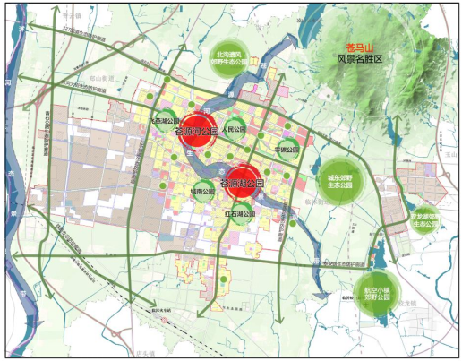 构筑“一带、两城、四郊、六片、多节点”的生态景观结构。一带为苍源河生态景观带;两城为苍源河公园、苍源湖公园;四郊:北沟遗风野生态公园、城东郊野生态公园、双龙湖郊野生态公园、航空小镇郊野公园;六片为飞燕湖公园、人民公园、零碳公园、城南公园、红石湖公园;多点为点状分布于各个社区的社区公园和游园。